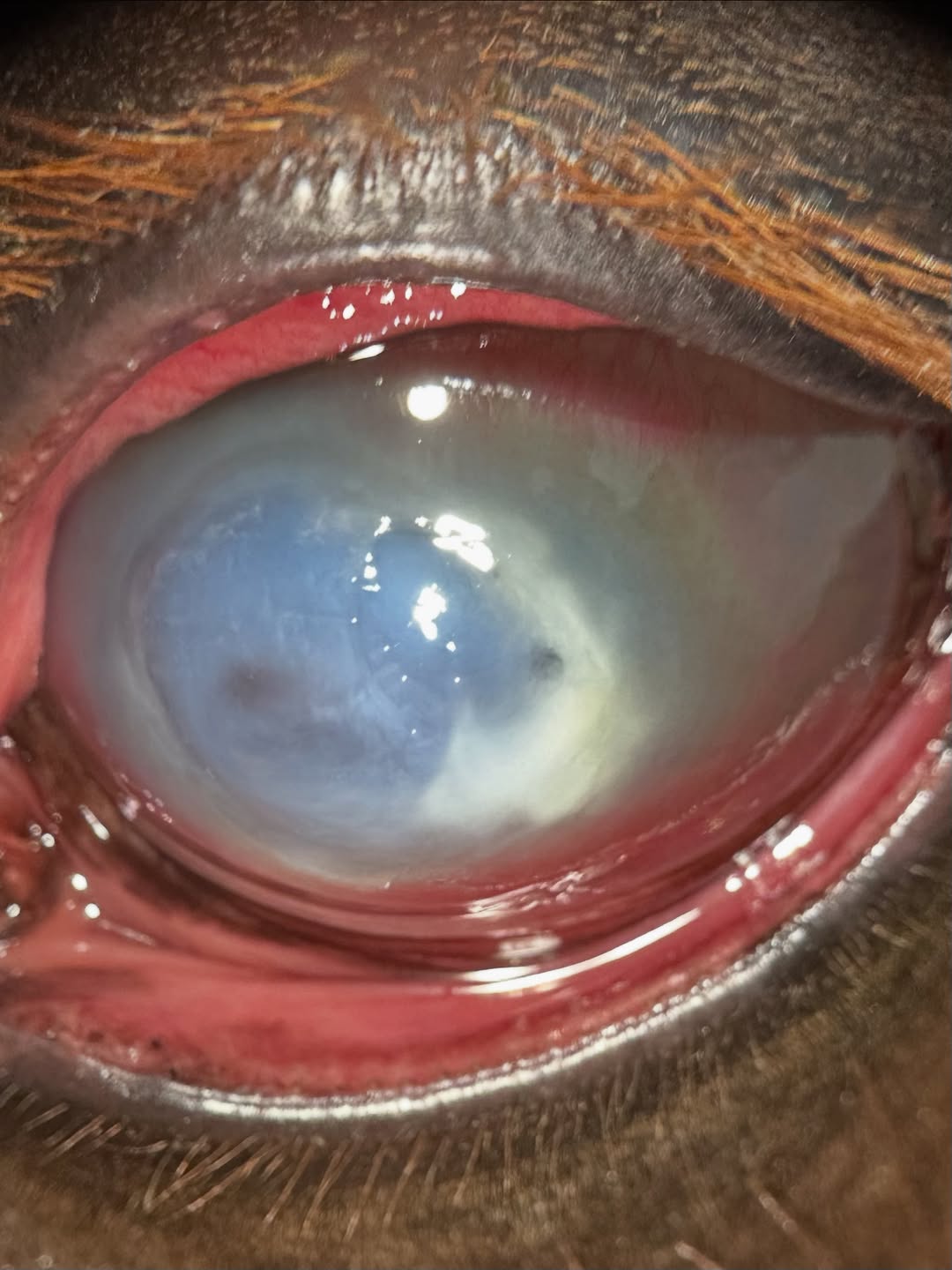 This horse was initially seen about a month ago and diagnosed with a corneal abscess, as seen in the first two photos. Basically a nasty corneal ulcer that became infected, and sealed over with bacteria and/or fungus trapped in the deeper layers of the cornea. This is unfortunately common in horses and can be really difficult to treat.