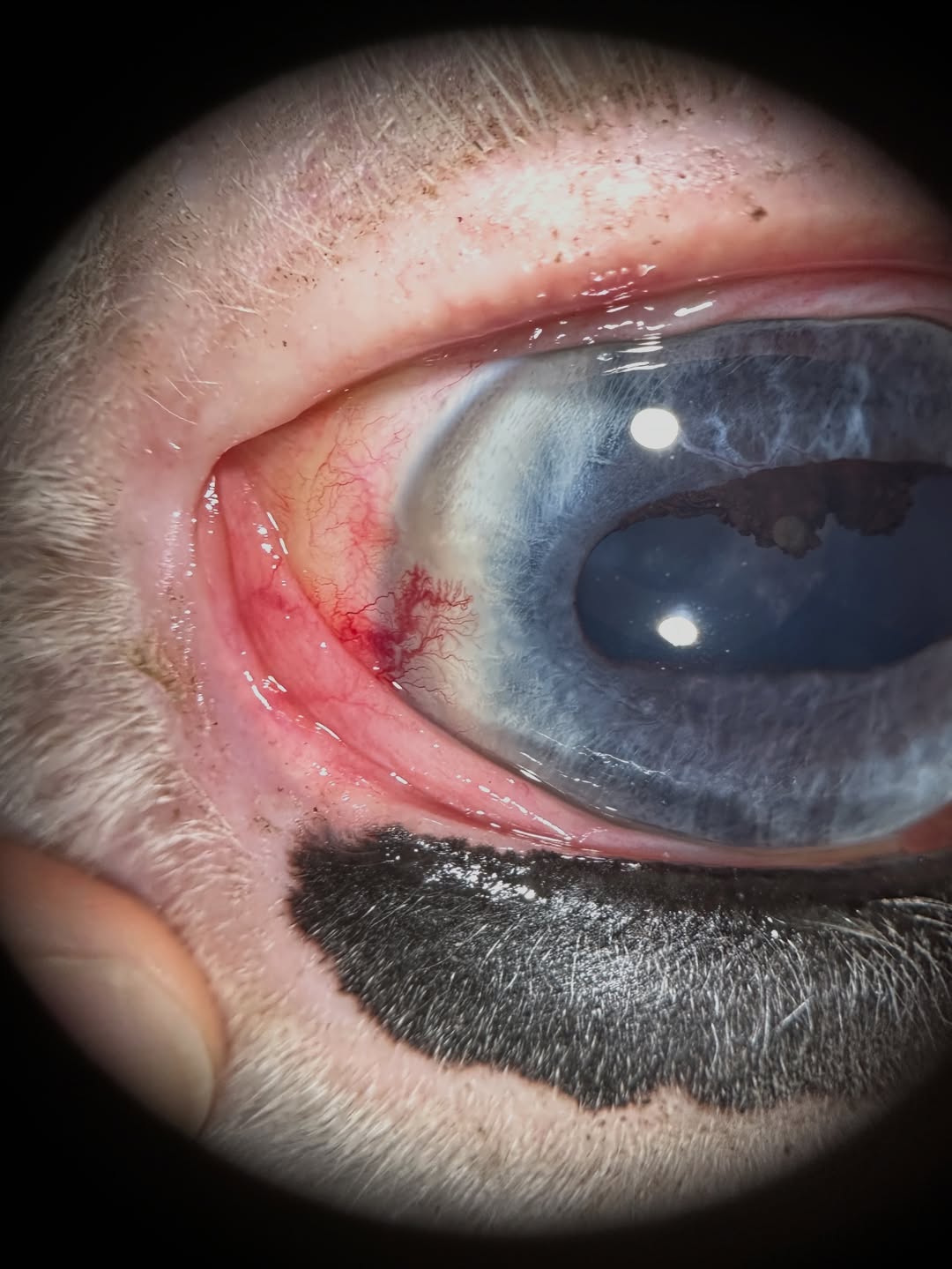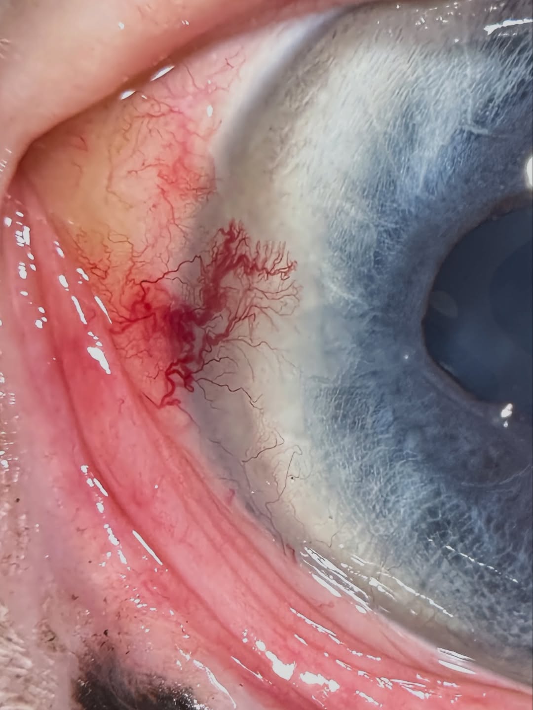 This horse has raised, inflamed corneoscleral vessels at the outer corner (lateral limbus) of the eye. This can be a type of immune keratitis, but I am concerned about a cancer called squamous cell carcinoma. This is common in horses around the eyes due to high sun exposure, especially in areas with no pigment. Some breeds are more predisposed due to genetics, like Belgians and Haflingers.
