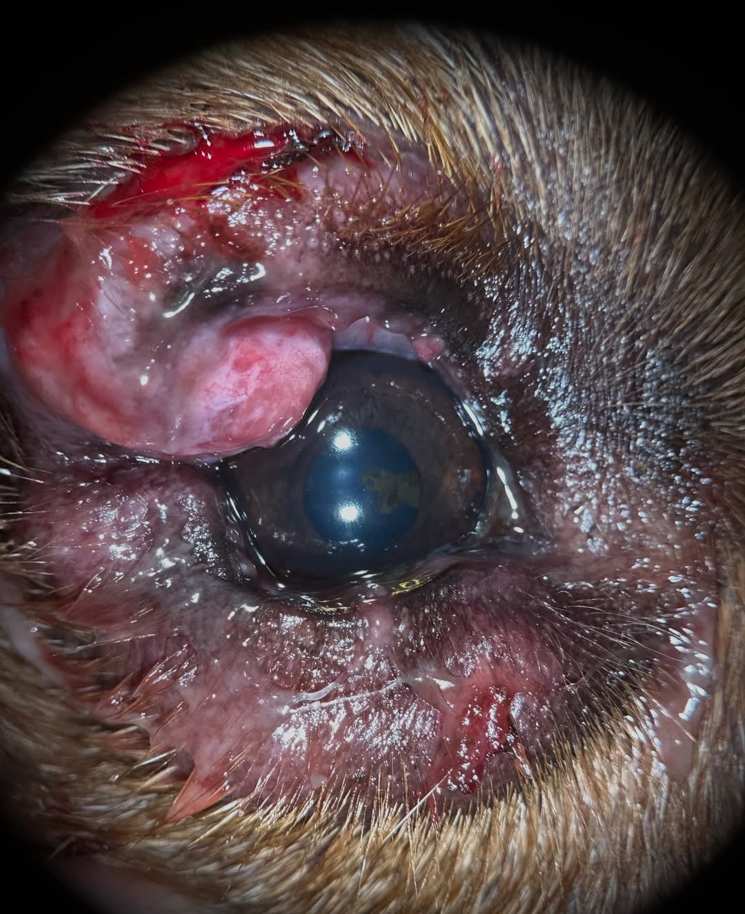 Blepharitis is a blanket term for inflammation of the eyelids, and this dog has a VERY severe case. He was initially diagnosed with a mass in the right eyelid and surgery was planned, but it worsened significantly and he was referred to me for further diagnostics and treatment.